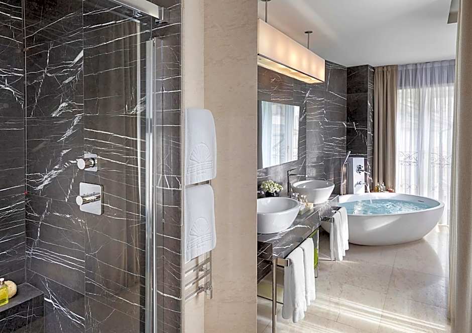 This elegant suite features a bedroom, a living room, and an Italian-marble bathroom with a large walk-in shower and a bathtub.
